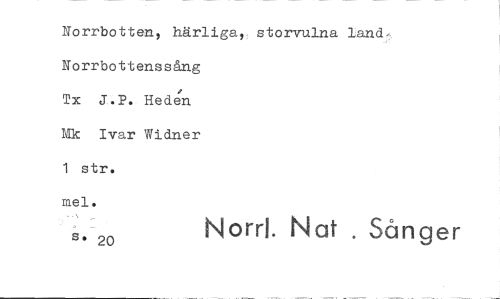 //// Norrbotten, härliga,, storvulna land Norrbottenssång //// Tx J.P. Heden Mk Ivar Widner 1 str. Norrl. Nat . Sånger //// mel. //// 20 ////