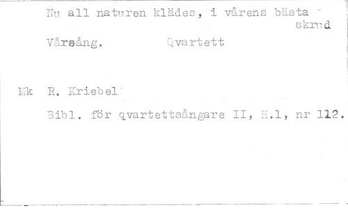 //// Nu all naturen klädes, i vårens bästa - //// skrud //// Våreång. Qvartett //// Ylk R. Kriebel //// Bibi. för qvartettsångare II, .1, nr 112. ////