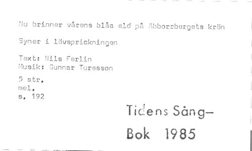 //// Mu brinner vårens blåa eld på nbborrbergets krön Syner i lövsprickningen //// Text: Mils Ferlin Musik: Gunnar Turesson //// 5 str. mel. //// s. 192 //// Tic:ens Sång— //// Bok 1985 ////