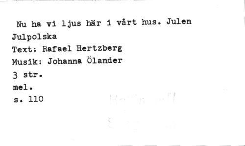 //// Nu ha vi ljus här i vårt hus. Julen Julpolska //// Text: Rafael Hertzberg //// Musik: Johanna Ölander //// 3 str. mel. //// s. 110 ////