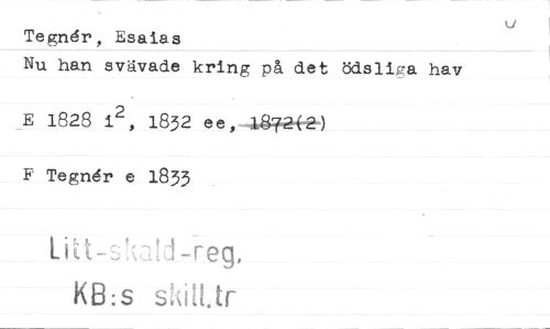 //// Li I //// Tegndr, Esaias //// Nu han svävade kring på det ödsliga hav //// E 1828 12, 1832 ee, 447-24-20 //// F Tegndr e 1833 //// -reg, //// KB:s s,,111.tr ////