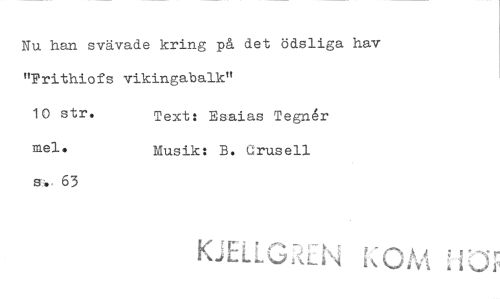 //// Nu han svävade kring på det ödsliga hav "Prithiofs vikingabalk" //// 10 str. mel. Text: Esaias Tegnér Musik: B. elrusell //// s. 63 //// K rEL' //// LA,..7KLI ////