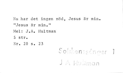 //// Nu har det ingen nöd, Jesus är min. "Jesus är min." //// Mel: J.A. Hultman //// 5 str. //// Nr. 20 s. 23 //// 7t. //// a n ////