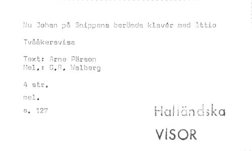 //// Nu Johan på Snippens berömda klavår med åttio Tvååkersvisa //// Text: Arne Pärson Mel.: G, R. Walberg //// 4 str. mel. //// s. 127 Haliönciska //// VISOR ////