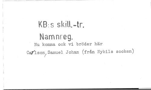 //// KB:s skal-tr. //// Narnnreg. //// Nu komma ock vi bröder här //// Carlson Samuel Johan (från Nykils socken) ////