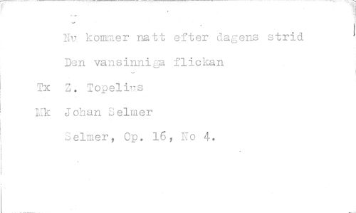 //// DI kommer natt efter dagens strid Den vansinniga flickan //// Tx Z. Topelirs //// Nk Johan Selmer //// Salmer, Op. 16, No 4. ////