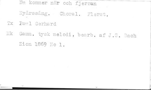 //// Nu kommer när och fjerran //// Nyårssång. Choral. Flerst. //// Tx Pari Gerhard //// 17.k Gam, tysk melodi, bearb. af J.S. Bach Zion 1869 No 1. ////