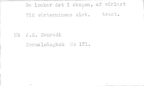 //// Nu lockar det i skogen, af vårlast Vid vårterminens slut. trest. //// Tlk J.G. Conradi Normalsångbok No 121. ////