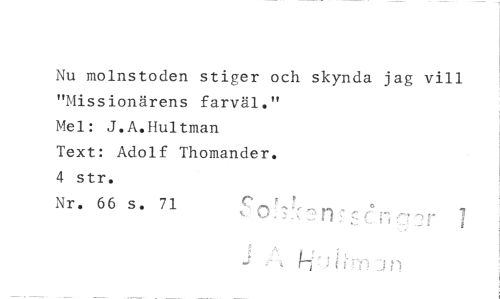 //// Nu molnstoden stiger och skynda jag vill "Missionärens farväl." //// Mel: J.A.Hultman //// Text: Adolf Thomander. //// 4 str. //// Nr. 66 s. 71 r //// , 0 //// „„,o2n:.Cf` //// , //// P //// _ //// r-j ; i i' 3 _J tl ////