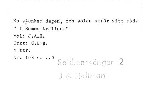 //// Nu sunker dagen, och solen strör sitt röda " 1 Sommarkvällen." //// Mel: J.A.H. //// Text: C.B-g. //// 4 str. //// Nr. 108 s. ..0 n //// g 7tFan ////