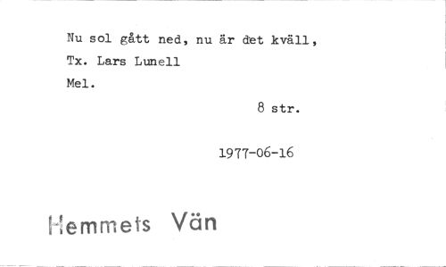 //// Nu sol gått ned, nu är det kväll, Tx. Lars Lunell //// Mel. //// 8 str. //// 1977-06-16 //// Hemmeis Vän ////