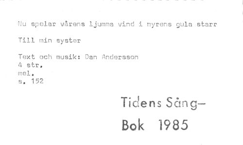 //// Nu spelar vårens ljumma vind i myrens gula starr Till min syster //// Text och musik: Dan Andersson 4 str. //// mel. //// s. 152 //// Tidens Sång— //// Bok 1985 ////