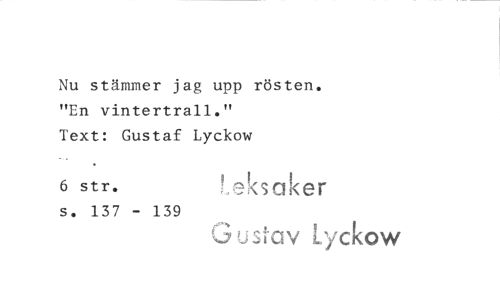//// Nu stämmer jag upp rösten. "En vintertrall." //// Text: Gustaf Lyckow //// 6 str. ksaker //// s. 137 - 139 //// Gustav Lyckow ////