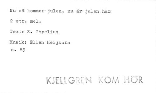 //// NU så kommenjulen, nu är' julen här:- 2 str. mel. //// Text: Töpelius //// Musik: Ellen Heijkorn s. 89 //// KJELJ GREN A " //// Å ////