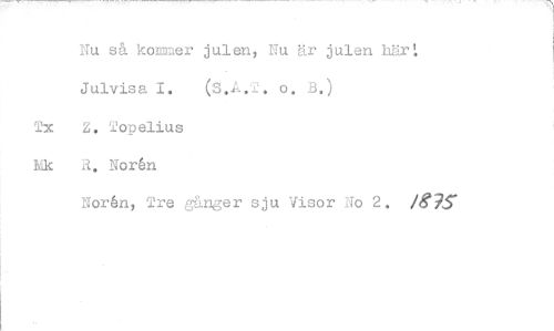//// Nu så kommer julen, Nu är julen här; Julvisa I. (S.A.2. o. B.) //// Tx z. Topelius //// R. Nor6n //// Nor6n, Tre gånger sju Visor No 2. ing ////