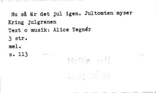 //// Nu så är det jul igen. Jultomten myser Kring Iulgranen //// Text o musik; Alice Tegn4r //// 3 str. //// mel. //// s. 113 ////