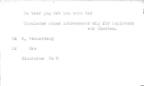 //// Au tror j det kan vara tid //// Huruledes månen intresserar sig för 'LAgistern //// och Glunten. //// Tx G. Wennerberg Nk D:o //// Gluntarne No 8 ////