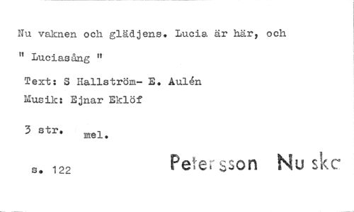 //// Nu våknen och glädjens, Lucia är här, och " Luciasång " //// Text: å Hallström— E. Aulen Musik: Ejnar Eklöf //// 3 stro //// so 122 Pele. Gan Nu .> ////