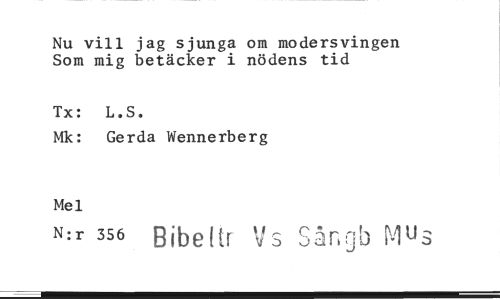 //// Nu vill jag sjunga om modersvingen Som mig betäcker i nödens tid //// Tx: L.S. //// Mk: Gerda Wennerberg //// Mel //// N:r 356 Bibeltr Sångb Mus ////