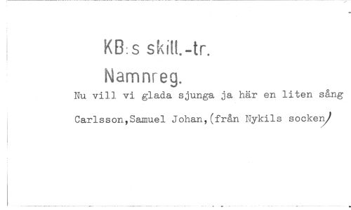 //// KB:s skal-tr. //// Namnreg. //// Nu vill vi glada sjunga ja här en liten sång Carlsson,Samuel Johan,(från Nykils socken) ////