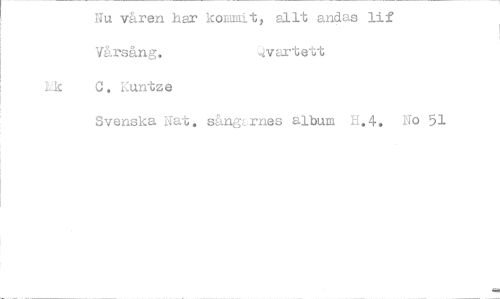 //// Nu våren har kommit, allt andas lif Vårsång. "4vartett //// Lk C. Kuntze //// Svenska Nat. sångLrnes album H.4. No 51 ////