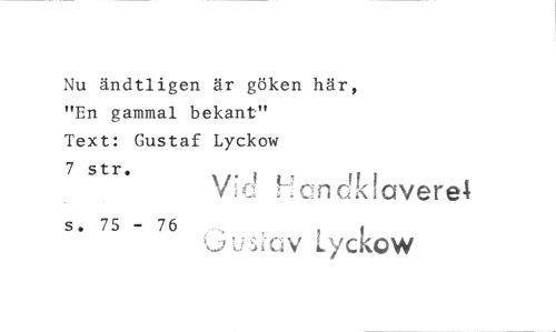 //// Nu ändtligen är göken här, "En gammal bekant" //// Text: Gustaf Lyckow //// 7 str. //// s. 75 - 76 //// Vid Handklaver& //// Lyckow ////