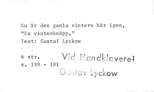 //// Nu är den gamla vintern här igen, "En vinterknäpp." //// Text: Gustaf Lyckow //// 6 str. Vid".endklevsurel //// s. 189 - 191 //// av Lyckow ////
