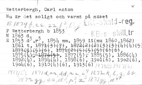 //// Wetterbergh, Carl Anton //// Nu är det soligt och varmt på näset Eter7J/kft,,,, AJ-reg, //// F Wetterbergh b 1853 - 12:P skilt.tr //// N 1863 d //// E 1853 d3,r3 18514. mm, 1859 ii(nu 1860,1862) //// 1861 t, 1871(3)( 1872(2)(2)(3)(3)(4)(4)(5: //// 1873( )(5) 6) tr(2)(5)(5)(5)(6)(6), //// 1875( 1877(5); 1885(5), 1886(4) //// 1892(), 1894( ), 1898(6), 19o1(6), 19o2(6), 19o4( ), 1910(4)(6), 1913(6) /n9(j/li //// .191/ig7/c(m-cl_ ,-,&£ "i Ag72.-i , 6 b- //// d4:ae-;/,,-; z Ii7jg Aiff ////