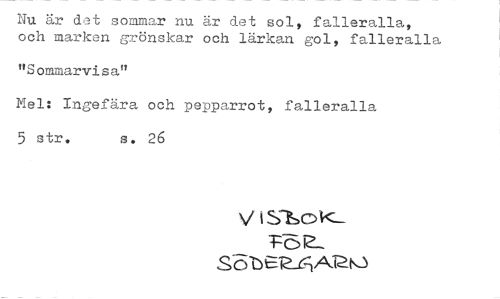 //// Nu är det sommar nu är det sol, falleralla, och marken grönskar och lärkan gol, falleralla //// "Sommarvisa" //// Mel: Ingefära och pepparrot, falleralla 5 str. s. 26 //// V S-15oK_ //// .*-5 //// S-6-b Ek_6:1A1•24.3 ////