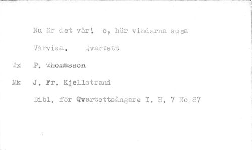 //// Nu är det vårt o, hör vindarna susa Vårvisa. --Qvartett //// Tx P. wilowaseon //// 1k J. Fr. Kjellstrand //// Bibi. för Qvartettsängare I. H. 7 No 87 ////