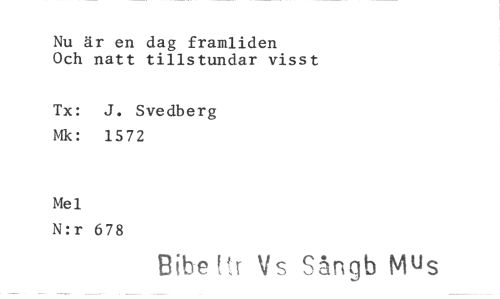 //// Nu är en dag framliden //// Och natt tillstundar visst //// Tx: J. Svedberg Mk: 1572 //// Mej. //// N:r 678 //// Bibe h- V s Sångb Mus ////