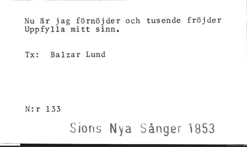 //// Nu är jag förnöjder och tusende fröjder Uppfylla mitt sinn. //// Tx: Balzar Lund //// N:r 133 //// Sions Nya Sånger 1853 ////