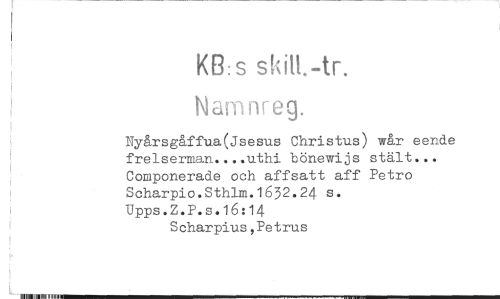 //// KB:s //// Narmireg. //// Nyårsgåffua(Jsesus Christus) wår eende frelserman...uthi bönewijs ställ... Componerade och affsatt aff Petra Scharpio.Sthlm.1632.24 s. TJpps.Z.P.s.16:14 //// Scharpius,Petrus //// _ //// Ilifinfirnlinelfill^^•^^••••^«..m...mm,mmenffim^^^• ////
