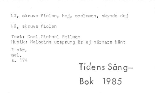 //// Må, skruva fiolen, hej, speleman, skynda dej Nå, skruva fiolen //// Text: Carl Michael Bellman //// Musik: Melodins ursprung är ej närmare känt //// 3 str. //// mel. //// s. 174 //// Tidens Sång— //// Bok 1985 ////