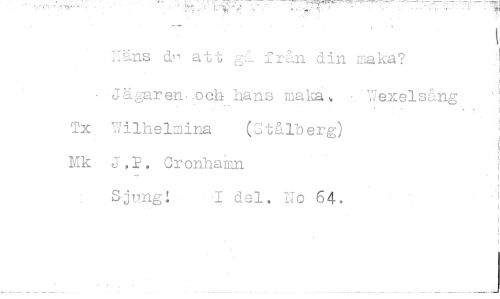 //// Näns dn att gfl från din maka? //// Jägaren och hans maka, - 77exelsång Tx Vilhelmina (Stålberg) //// Mk J.P. Cronhamn //// Sjung 1 del. No 64. //// j ////