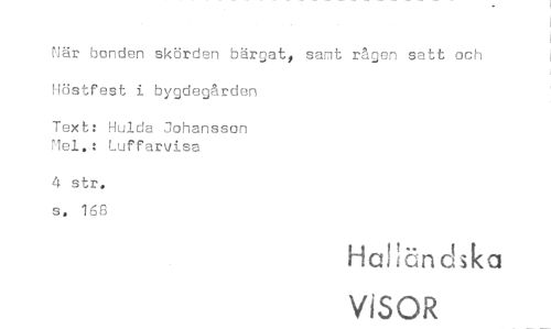 //// När bonden skörden bärgat, samt rågen satt och Höstfest i bygdegården //// Text: Hulda Johansson Mej..: Luffarvisa //// 4 str„ s, 168 //// Hal län //// ViSOR ////
