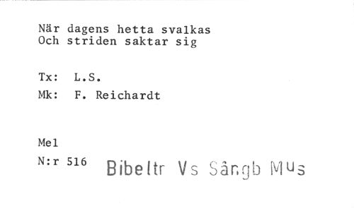 //// När dagens hetta svalkas Och striden saktar sig //// Tx: L.S. //// Mk: F. Reichardt //// Mel //// N:r 516 Bibeftr Vs Sångb Mus ////