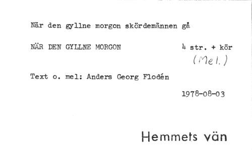 //// Når den gyllne morgon skördemännen gå //// NÄR DEN GYLLNE MORGON 4 str. + kör //// ( ) //// Text o. mel: Anders Georg Floden //// 1978-08-03 //// Hemmets vän ////