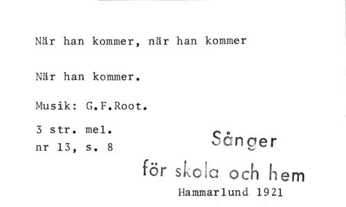 //// När han kommer, när han kommer //// När han kommer. Musik: G.F.Root. //// 3 str. mel. Sånger //// nr 13, s. 8 för sko ga och hem //// Hammarlund 1921 ////