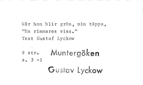 //// När hon blir grön, min täppa, "En rimmares visa." //// Text Gustaf Lyckow //// 9 str. Mun teraöken //// s. 3 -5 //// Gustav Lyckow ////