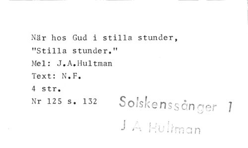 //// När hos Gud i stilla stunder, "Stilla stunder." //// Mel: J.A.Hultman //// Text: N.F. //// 4 str. //// Nr 125 s. 132 //// o //// szenson ,-Tnr //// so ////