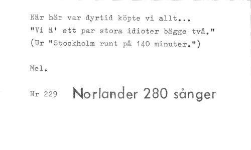 //// När här var dyrtid köpte vi allt... //// "Vi ä' ett par stora idioter bägge två." (Ur "Stockholm runt på 140 minuter.") //// Mel. //// Nr 229 Norlander 280 sånger ////