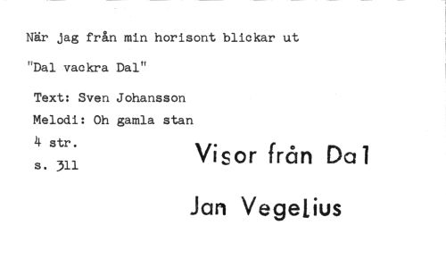 //// När jag från min horisont blickar ut "Dal vackra Dal" //// Text: Sven Johansson //// Melodi: Oh gamla stan 4 str. Visor från Da 1 //// s. 311 //// Jan Vegelius ////