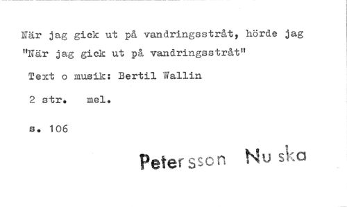 //// När jag gick ut på vandringsstråt, hörde jag "Nät jag gick ut på vandringsstråt" //// Text o musik: Bertil Wallin 2 strö mel. //// s. 106 //// Petersson u s a ////