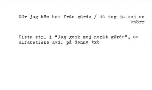 //// När jag köm hem från gärde / då tog ja mej en //// knörr //// Sista str. i "Jag geck mej neråt gärde", se alfabetiska avd. på denna txb ////