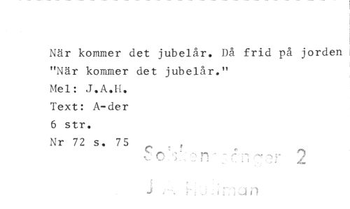 //// 1 //// När kommer det jubelår. Då frid på jorden //// "När kommer det jubelår." //// Mel: //// Text: A-der 6 str. //// Nr 72 s. 75 ////