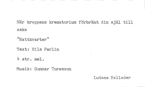 //// När kroppens krematorium förbränt din själ till aska //// "Nattkvarter" //// Text: Nils Ferlin //// 4 str. mel. //// Musik: Gunnar Turesson //// Lutans Ballader ////