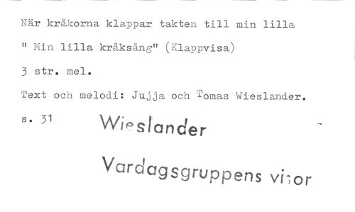 //// När kråkorna klappar takten till min lilla " Min lilla kråksång" (Klappvisa) //// 3 str. mel. //// Text och melodi: Jujja och Tomas Wieslander. //// s. 31 Wi slander //// Vardagsgruppens vior ////