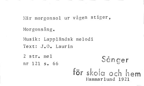 //// När morgonsol ur vågen stiger, Morgonsång. //// Musik: Lappländsk melodi Text: J.O. Laurin //// 2 str. mel nr 121 s. 66 Sån c e r //// för sk [ cl och 1 em //// Hammarlund 1921 ////