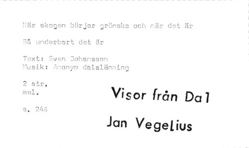 //// När skogen börjar grönska och när det är Så underbart det är //// Text: Sven Johansson Musik: Anonym dalslänning //// 2 str. mei. Visor från Da 1 //// s. 246 Jan VegeLius ////